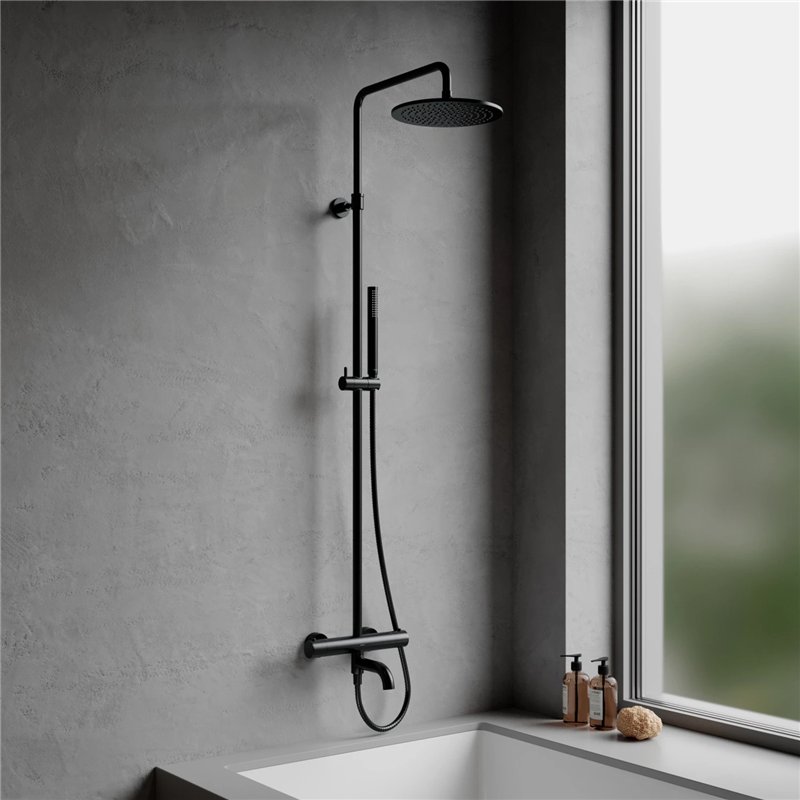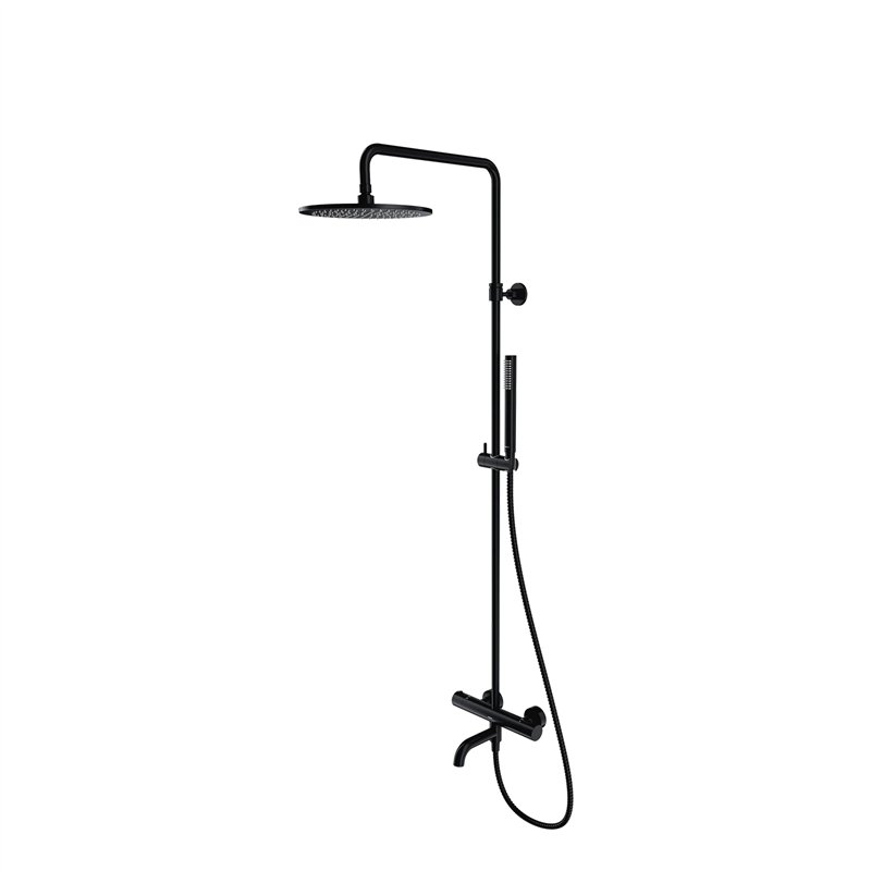 L’ensemble comprend un mitigeur thermostatique, une tête de douche avec bras, un bec de baignoire pliable, un pommeau de douche avec flexible ainsi qu’un support réglable en hauteur.