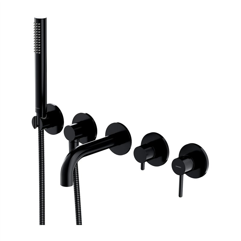 Mitigeur de baignoire à encastrer 5 trous Collection Y avec douchette 1 fonction, flexible 125 cm, mousseur AIR WATER et installation sur plage, disponible en plusieurs finitions.
