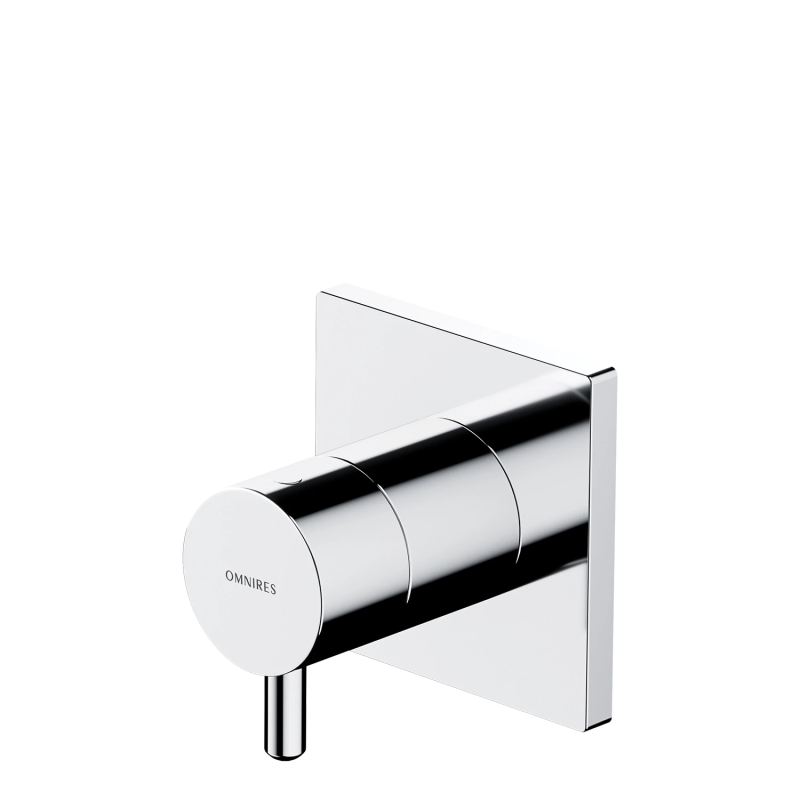Inverseur 3 voies à encastrer Collection Y en chrome poli avec rosette 9 x 9 cm, 1 entrée et 3 sorties 1/2", position arrêt et élément encastré inclus.