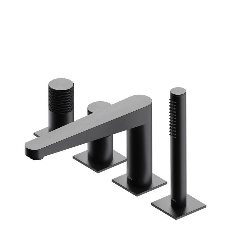 Mélangeur de baignoire à 4 trous avec douchette intégrée. Confort optimal, entretien facile et design architectural distinctif.