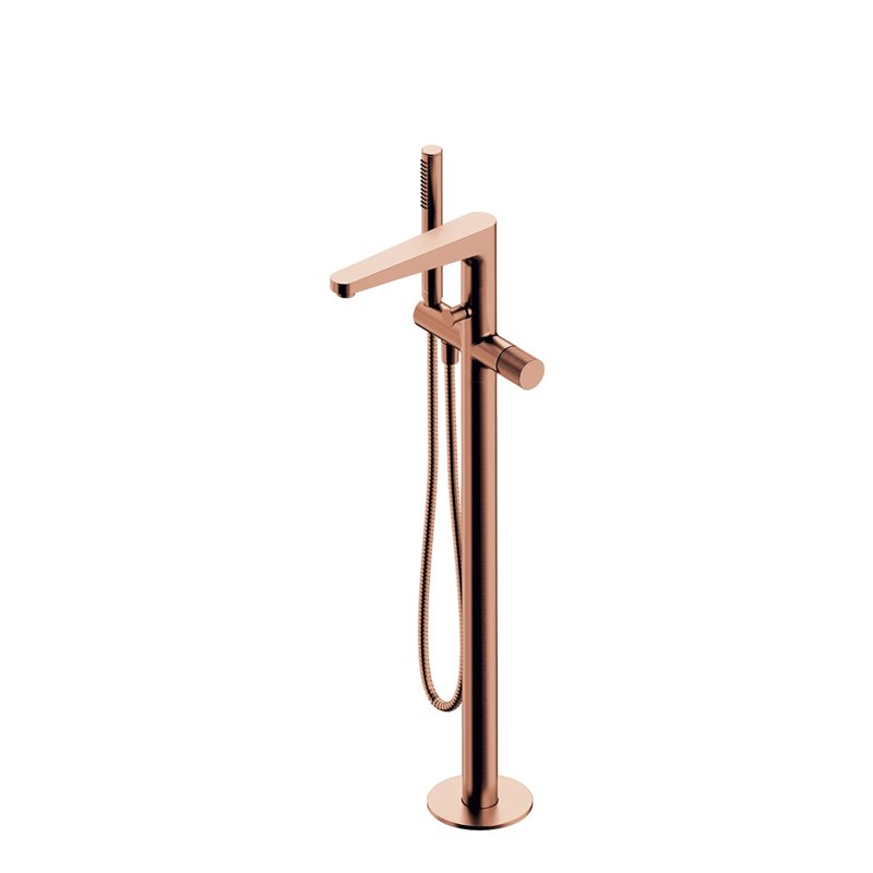 Mélangeur de baignoire autonome avec douchette intégrée. Installation au sol, design architectural et confort optimal.