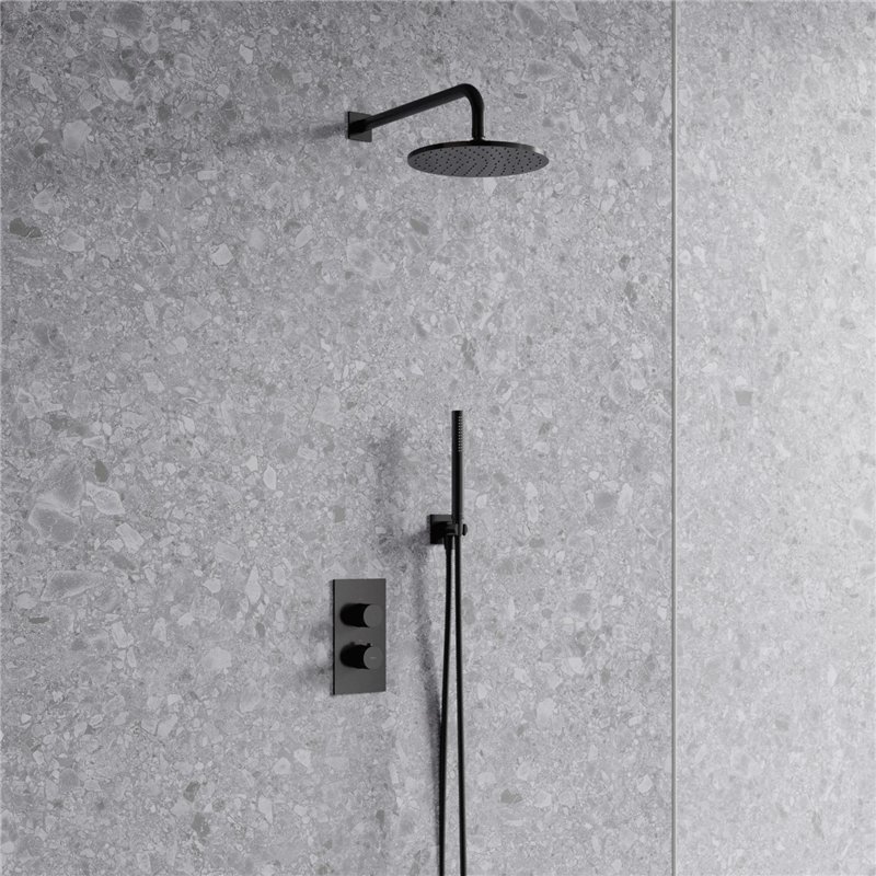 Le système comprend une tête de douche en laiton (ø25 cm) offrant une diffusion large et homogène de l’eau, un bras mural, ainsi qu’un pommeau de douche à main à 1 fonction avec flexible de 150 cm pour une utilisation complémentaire.