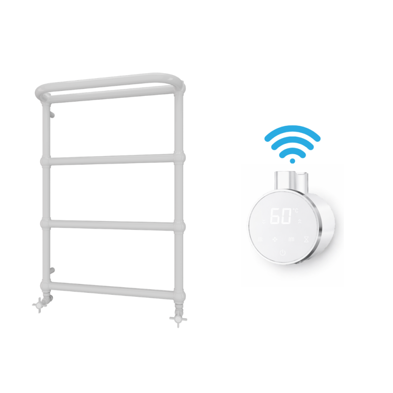 Radiateur électrique au design original avec éléments décoratifs et barre intégrée, idéal pour salle de bain. Il assure une montée en température rapide tout en maintenant vos serviettes sèches et chaudes.
