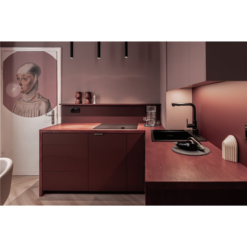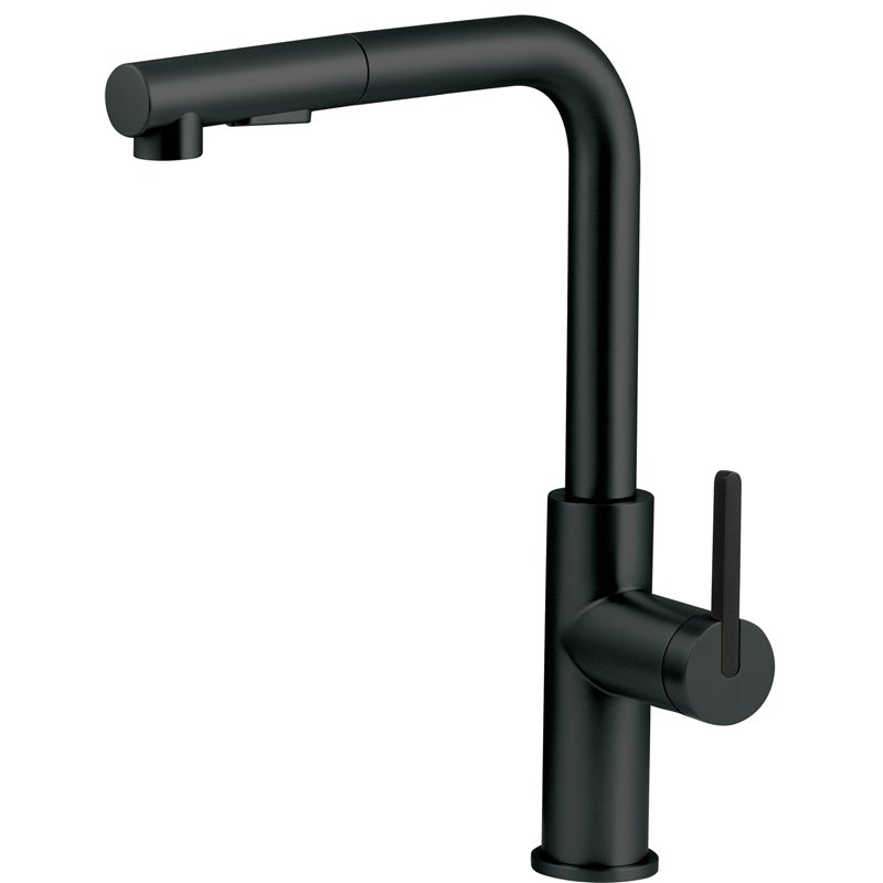 Disponible en finitions titane, noir, chrome, acier inoxydable brossé, or brossé, bronze brossé et blanc, le mitigeur d’évier MOMI avec bec extractible est conçu pour un usage pratique en cuisine.
