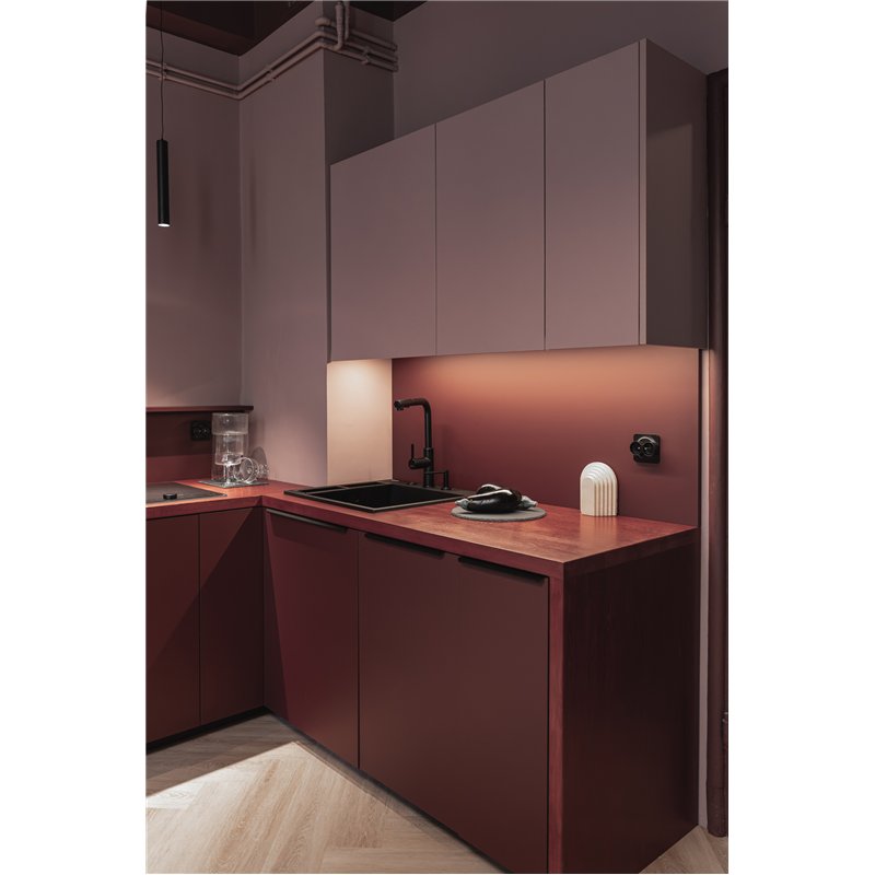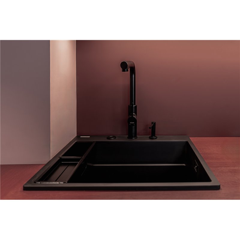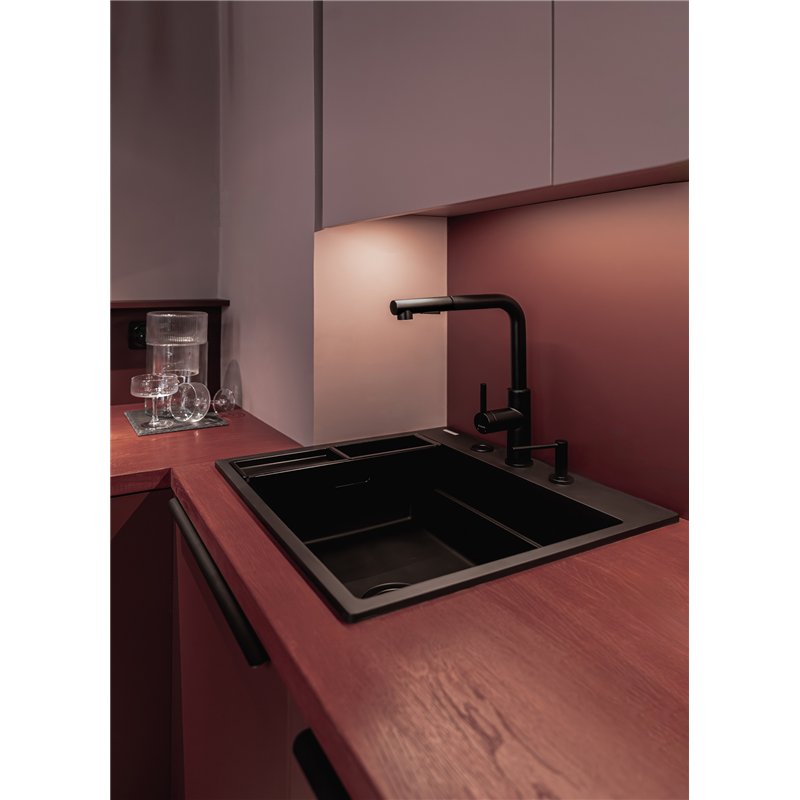 Son bec rectangulaire avec douchette extractible permet de nettoyer facilement l’évier, rincer les aliments ou remplir de grands récipients.
