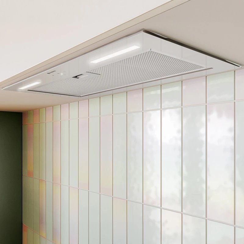 Hotte encastrable ultra-plate avec moteur déporté, offrant une cuisine silencieuse et une aspiration périmétrale performante. Design minimaliste en verre trempé Noir ou Blanc, installation invisible et éclairage LED pour un confort de cuisson inégalé.