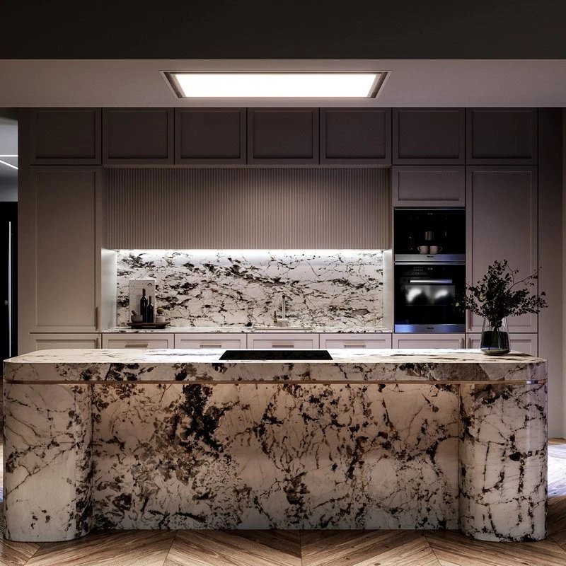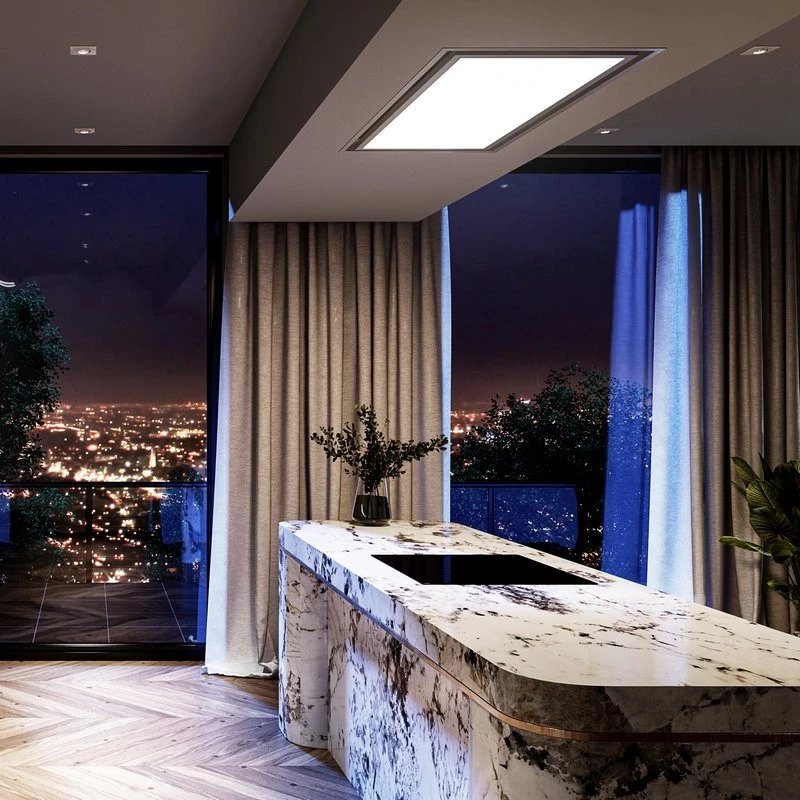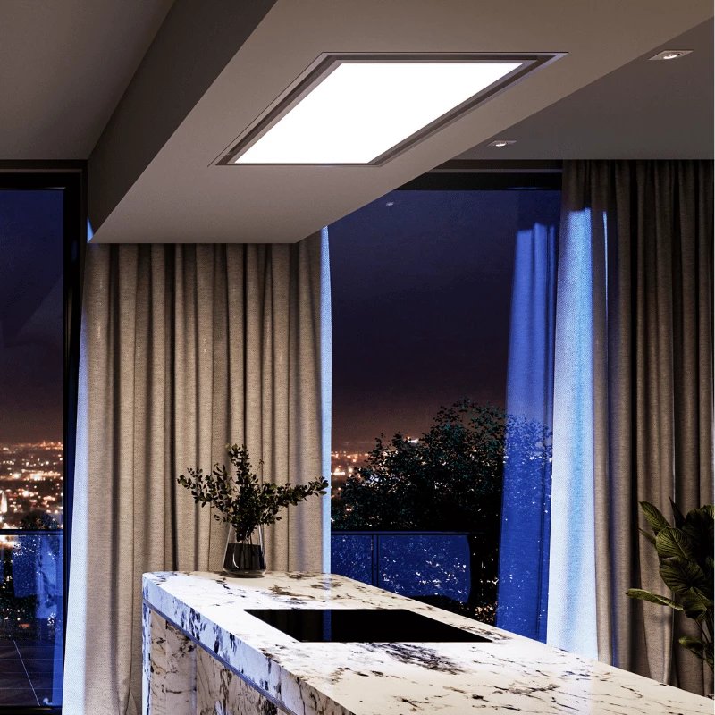 Son éclairage LED intégré (28W), avec intensité et température de couleur réglables de 2700K à 6000K, transforme la hotte en véritable source lumineuse centrale, créant une ambiance adaptée à chaque moment.