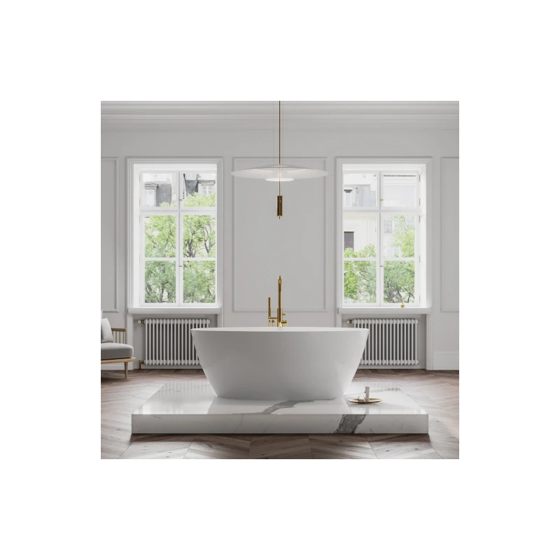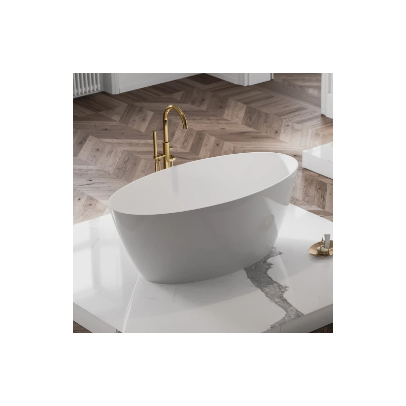 Baignoire îlot au design contemporain en matériau composite M+. Spacieuse et élégante, elle offre un confort optimal avec un volume de 390 L et se décline en finition blanc brillant ou blanc / noir brillance.