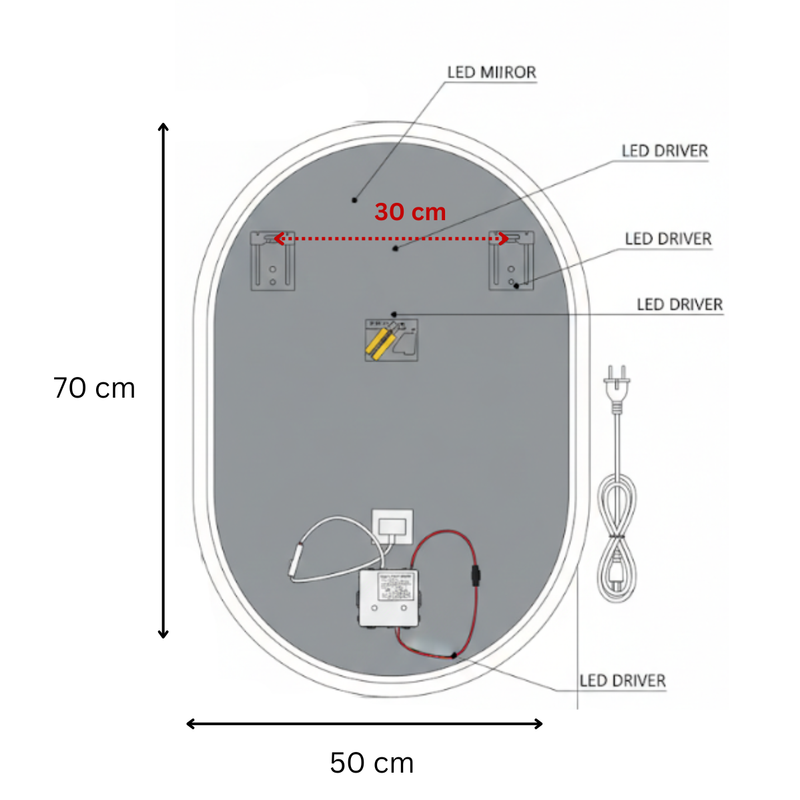 Miroir LED ovale OVALIA 50 x 70 cm avec éclairage LED intégré en façade, trois températures de lumière (chaud, neutre, froid), fonction anti-buée et protection IP44 adaptée aux salles de bain.