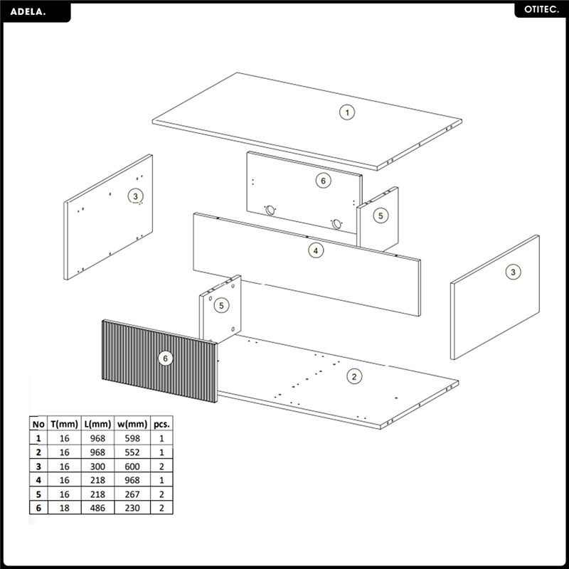 • Esthétique affirmée : Façades rainurées verticales, teinte chaleureuse du noyer, volumes équilibrés. ADELA impose une présence élégante et originale, sans alourdir l’espace.