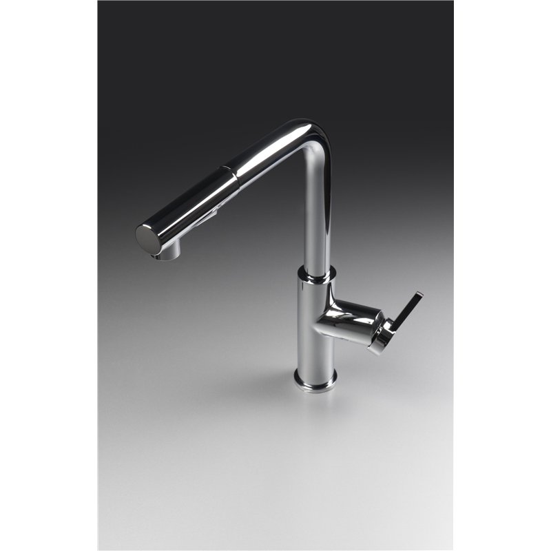 Disponible en finitions titane, noir, chrome, acier inoxydable brossé, or brossé, bronze brossé et blanc, le mitigeur d’évier MOMI avec bec extractible est conçu pour un usage pratique en cuisine.