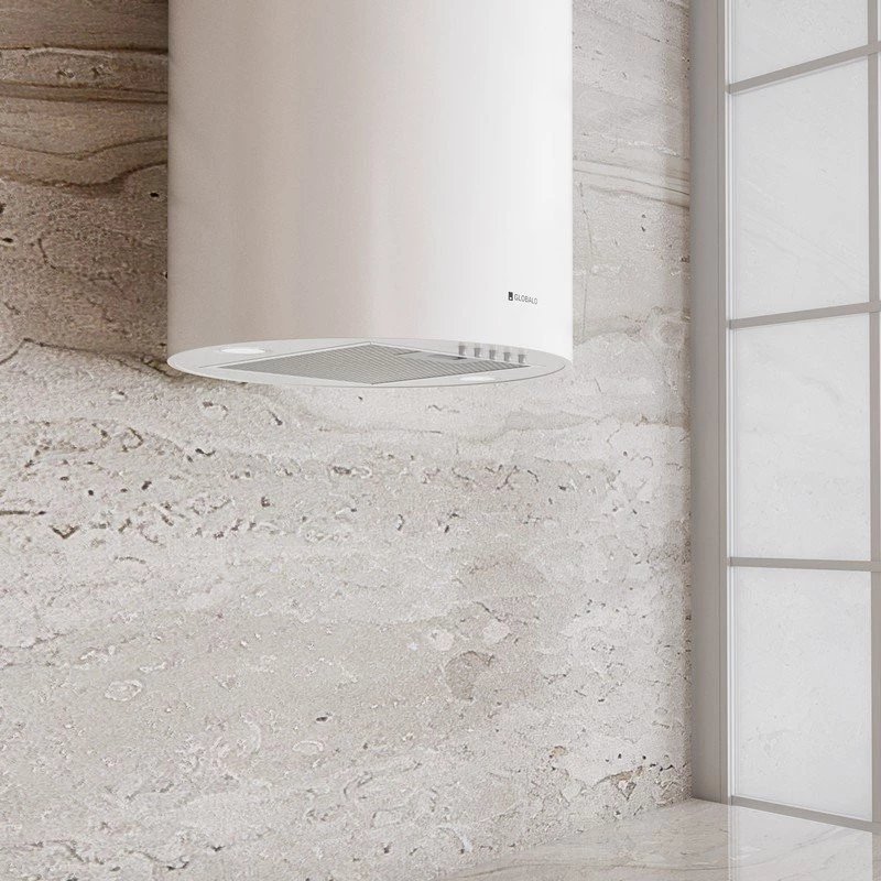 Hotte murale ronde Globalo Calmio 39.1 Carmel Gold, avec une puissance jusqu’à 570 m³/h et fonctionnement silencieux dès 47 dB. Éclairage LED, 4 vitesses et design doré élégant pour une cuisine moderne et raffinée.