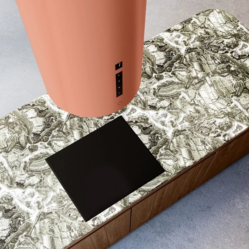 Hotte aspirante Cylindro Isola 39.7 avec une capacité de 742 m³/h et un fonctionnement ultra-silencieux à 46 dB. Disponible en plusieurs couleurs : Noir, Noir Ombre, Bleu, Doré, Vert, Cuivre, Rose, Blanc, Blanc Doré. Commandes Soft-Touch et éclairage LED réglable.