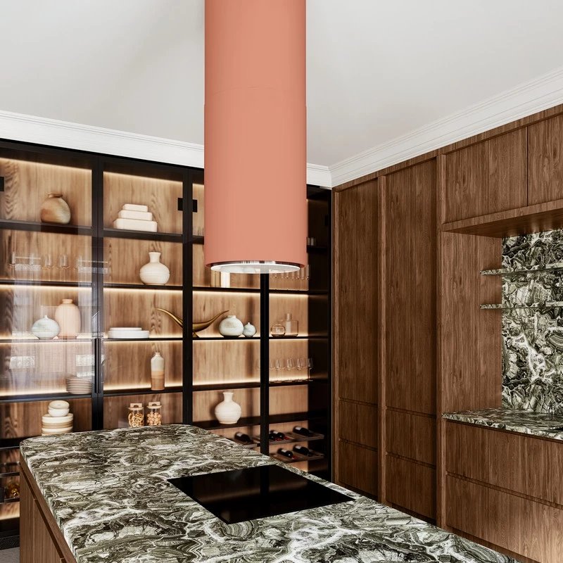 Hotte aspirante Callia Isola 39.1 disponible en Brique, Cachemire, Ivoire et Sauge. Performances d'aspiration jusqu'à 742 m³/h, fonctionnement silencieux à 46 dB. Éclairage LED avec réglage de la température de couleur, 3 vitesses et panneau Soft-Touch pour un contrôle facile.