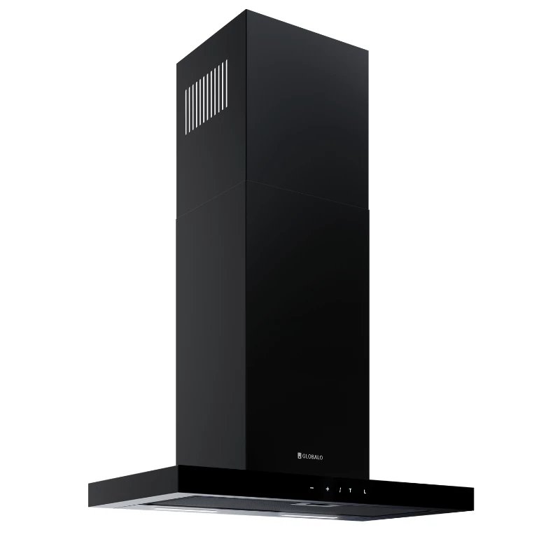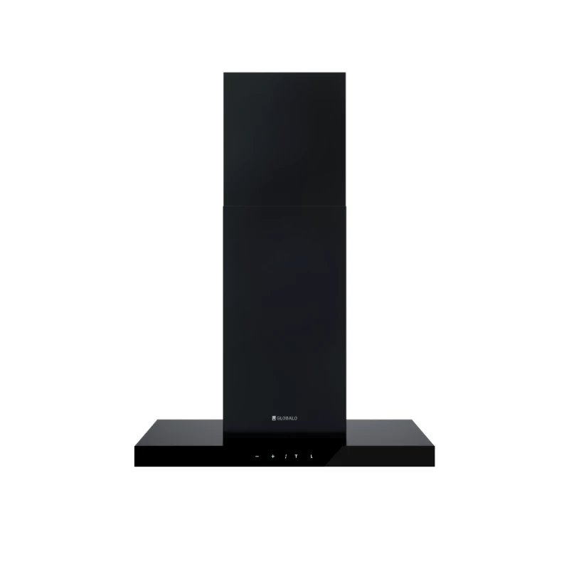 Hotte murale Globalo Aventelio 60.1 H2H Black, avec contrôle automatique depuis la plaque grâce à la technologie H2H. Puissance jusqu’à 555 m³/h, éclairage LED réglable (2900–6300K), 4 vitesses et design moderne en verre noir.