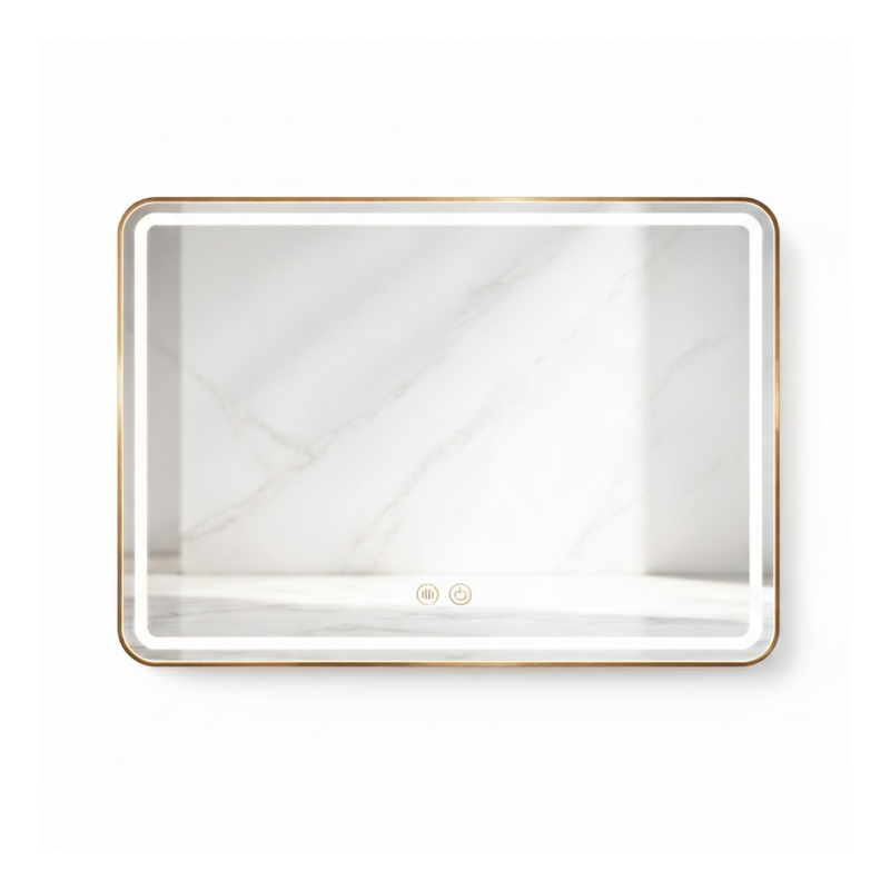 Miroir LED rectangulaire VALORIA 80 x 60 cm avec double éclairage LED (façade et rétroéclairé), trois températures de lumière, fonction anti-buée et indice IP44, disponible en noir, doré et rose gold.