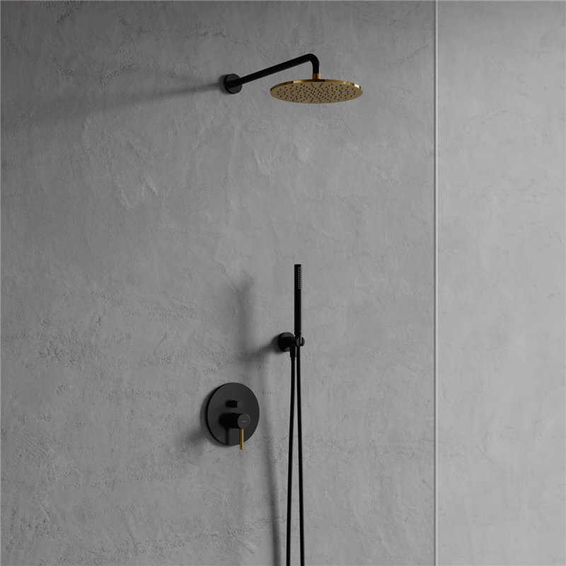 Système de douche encastré Collection Y en laiton, avec tête de douche Ø25 cm, bras de 41 cm, douchette 1 fonction avec flexible 150 cm, disponible en plusieurs finitions.