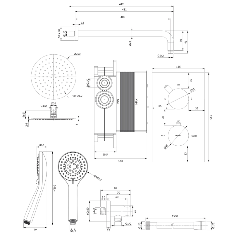 L’ensemble comprend un mitigeur thermostatique encastré à 2 sorties avec élément encastré, une tête de douche, un bras de douche, un pommeau de douche avec flexible ainsi qu’un raccord mural avec support, pour une installation complète.