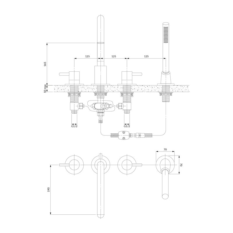 Mélangeur de baignoire à 4 trous avec douchette intégrée, idéal pour installation sur plage. Solution complète, cartouche céramique et finitions variées.