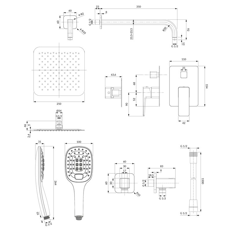Ce système associe un mélangeur encastré, une tête de douche large en acier inoxydable (25 x 25 cm), un bras mural, ainsi qu’une douchette à main 3 fonctions (pluie, jet d’eau, mixte). L’ensemble offre une expérience de douche polyvalente et confortable.