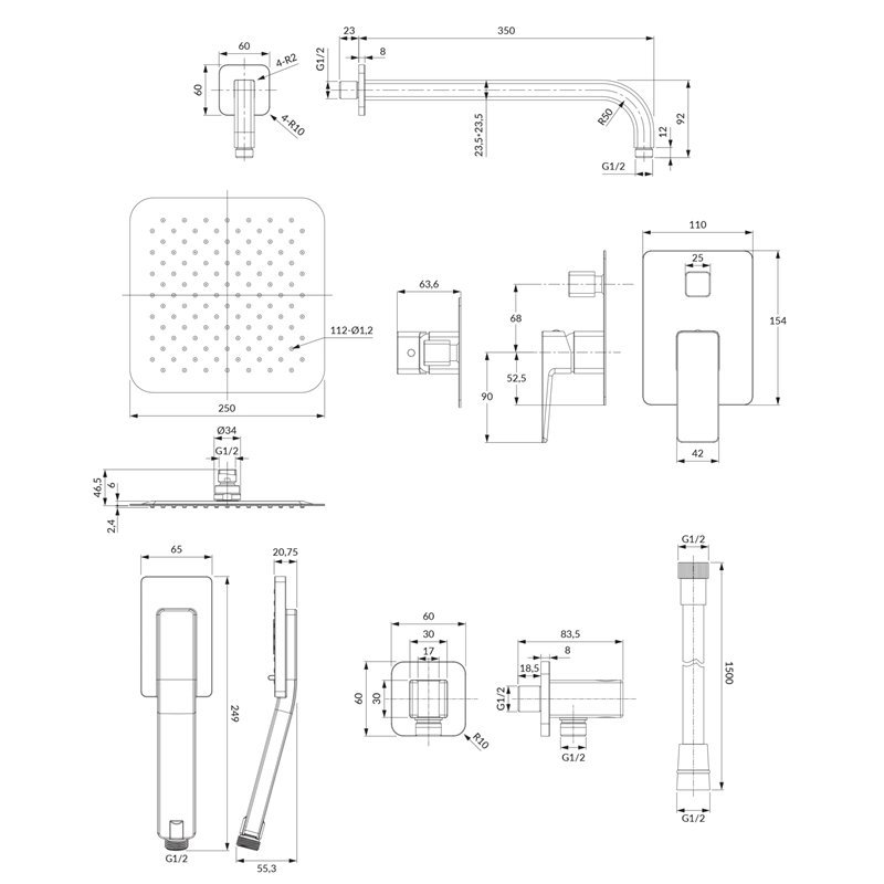 Ce système associe un mélangeur encastré, une tête de douche large en acier inoxydable (25 x 25 cm), un bras mural, ainsi qu’une douchette à main 3 fonctions (pluie, jet d’eau, mixte). L’ensemble offre une expérience de douche polyvalente et confortable.