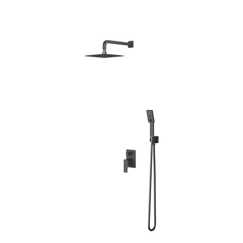 Ce système associe un mélangeur encastré, une tête de douche large en acier inoxydable (25 x 25 cm), un bras mural, ainsi qu’une douchette à main 3 fonctions (pluie, jet d’eau, mixte). L’ensemble offre une expérience de douche polyvalente et confortable.
