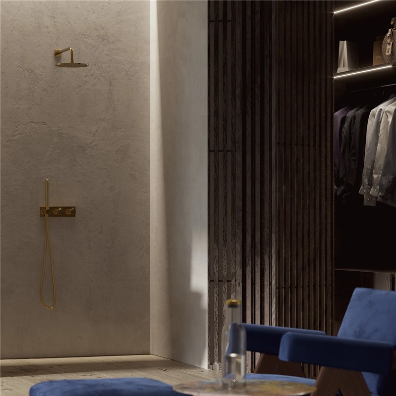 Mélangeur encastré bain/douche avec douchette intégrée. Installation murale épurée, contrôle précis et entretien facile.