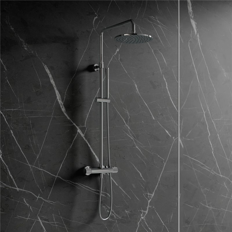 Système thermostatique de douche mural avec sécurité 38°C, tête large et hauteur réglable. Confort optimal et entretien facile.