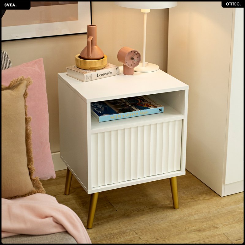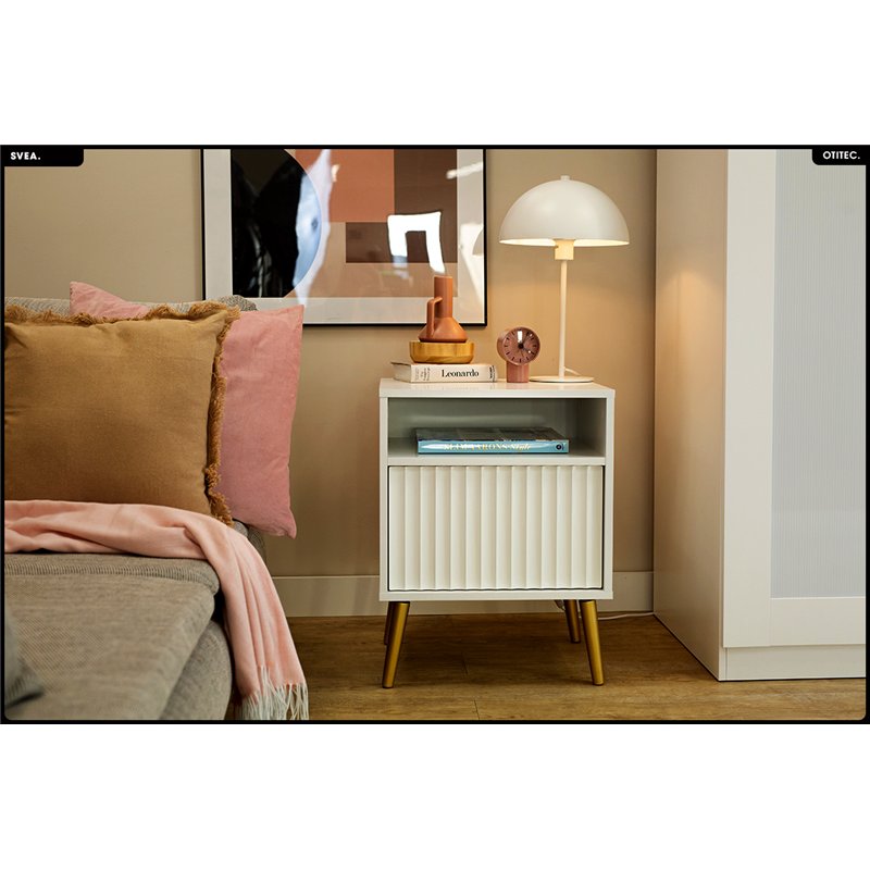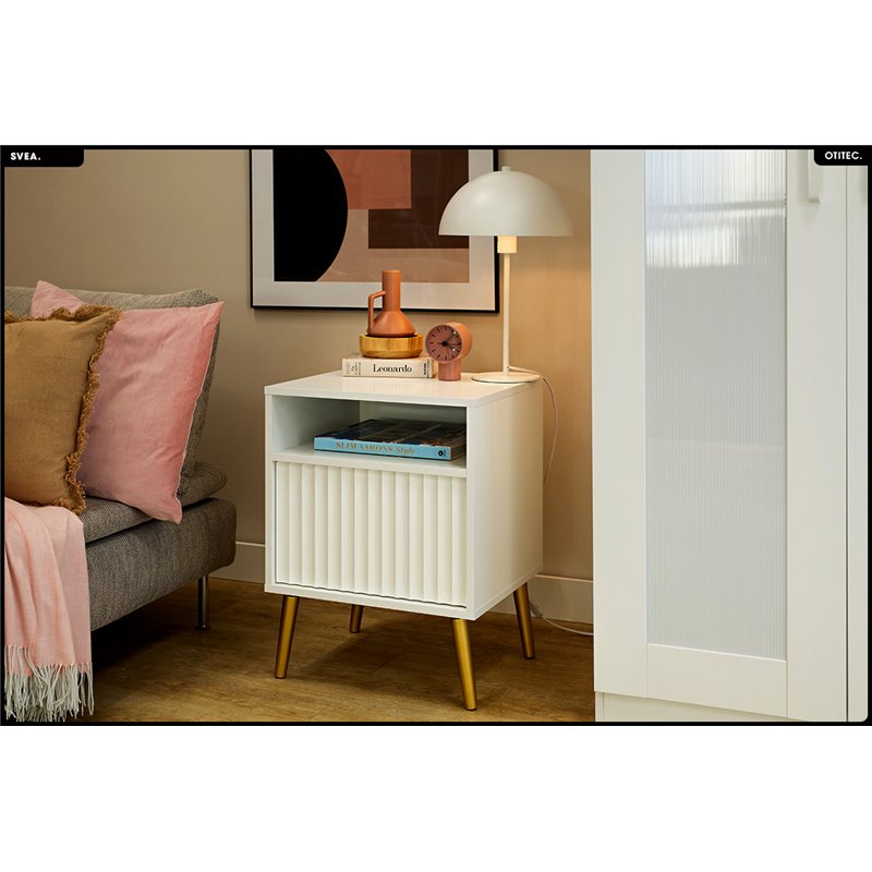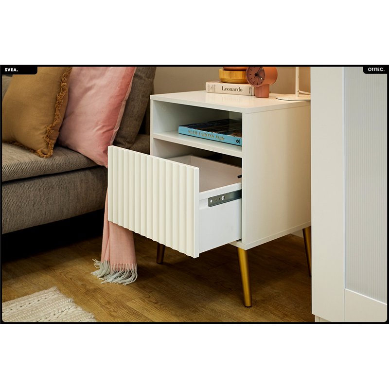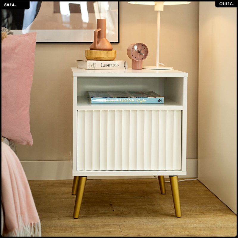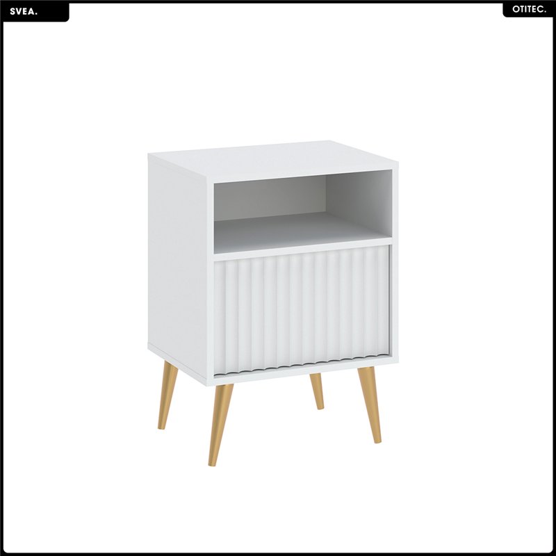 Un blanc lumineux, des façades sculptées et un piètement doré : la collection SVEA affirme un style épuré et raffiné, pensé pour faire respirer l’espace sans en gommer le caractère. Elle s’intègre naturellement dans un intérieur contemporain, tout en apportant une vraie personnalité.
