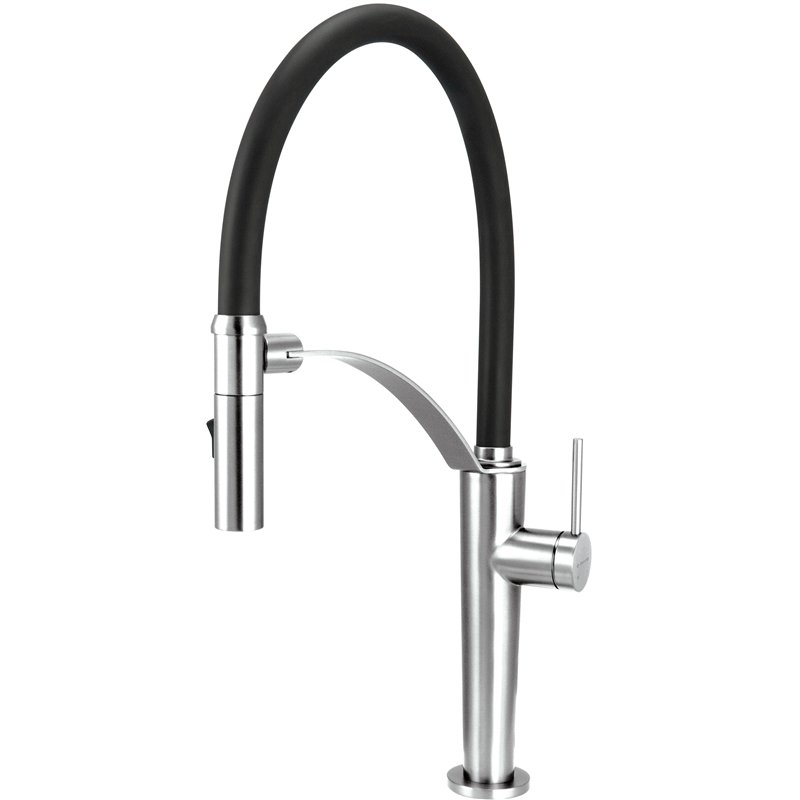 Mitigeur de cuisine avec bec col de cygne pivotant et douchette extractible, conçu en acier inoxydable.