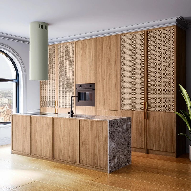 Hotte aspirante Callia Isola 39.1 disponible en Brique, Cachemire, Ivoire et Sauge. Performances d'aspiration jusqu'à 742 m³/h, fonctionnement silencieux à 46 dB. Éclairage LED avec réglage de la température de couleur, 3 vitesses et panneau Soft-Touch pour un contrôle facile.