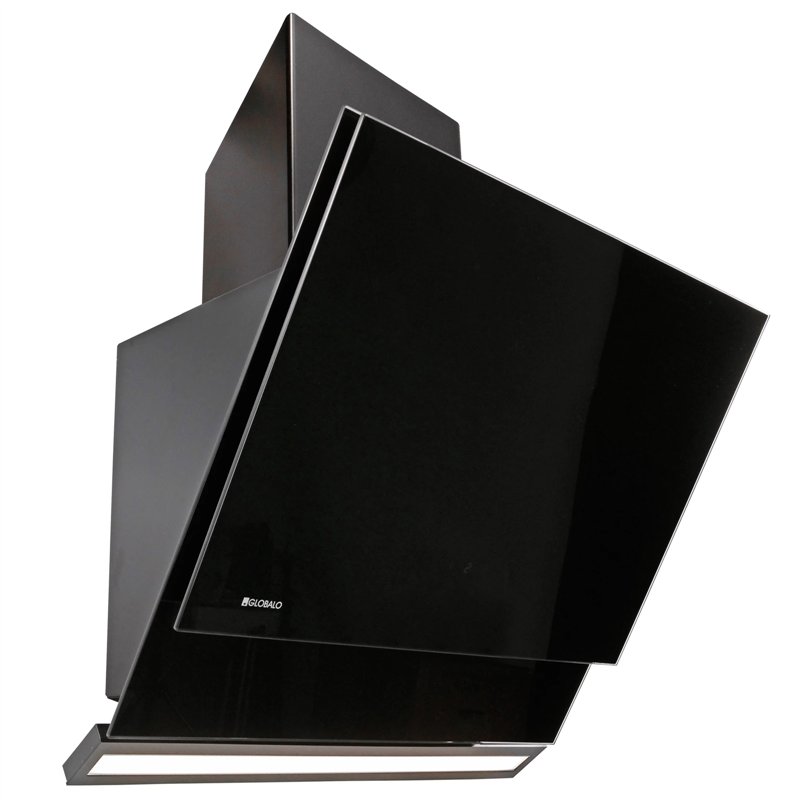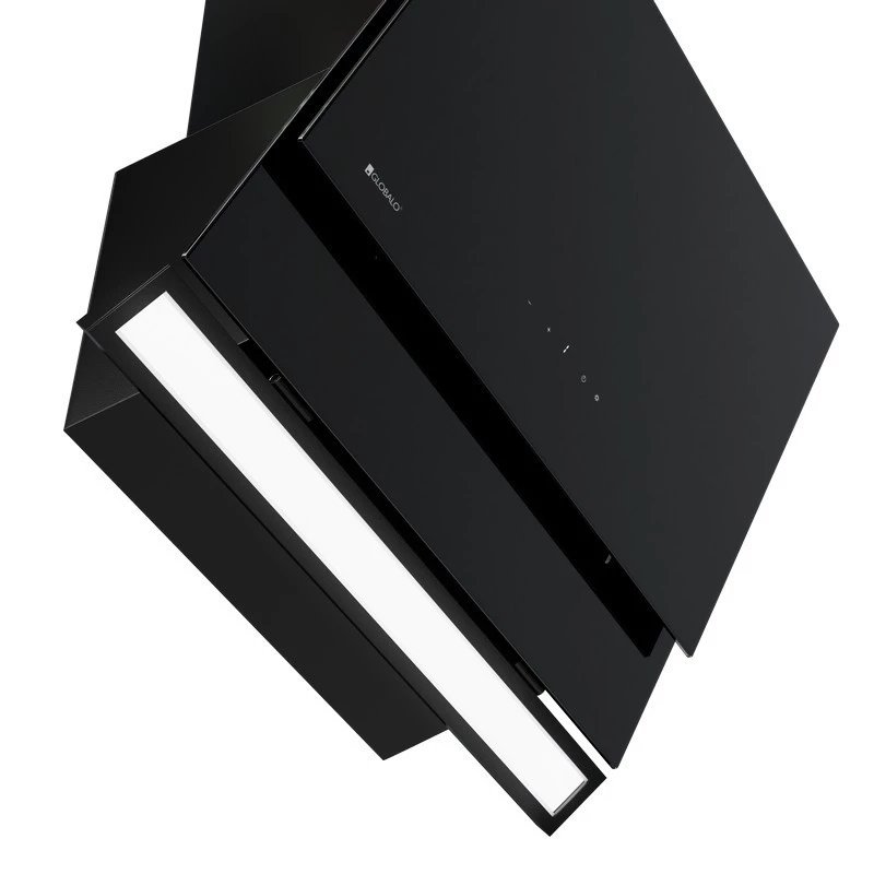 Hotte murale Globalo Aventelio 60.1 H2H Black, avec contrôle automatique depuis la plaque grâce à la technologie H2H. Puissance jusqu’à 555 m³/h, éclairage LED réglable (2900–6300K), 4 vitesses et design moderne en verre noir.