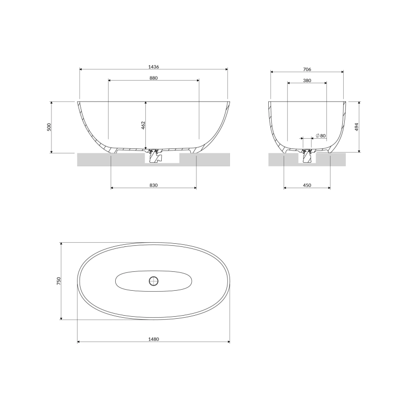 Baignoire îlot au design contemporain en matériau composite M+. Spacieuse et élégante, elle offre un confort optimal avec un volume de 390 L et se décline en finition blanc brillant ou blanc / noir brillance.