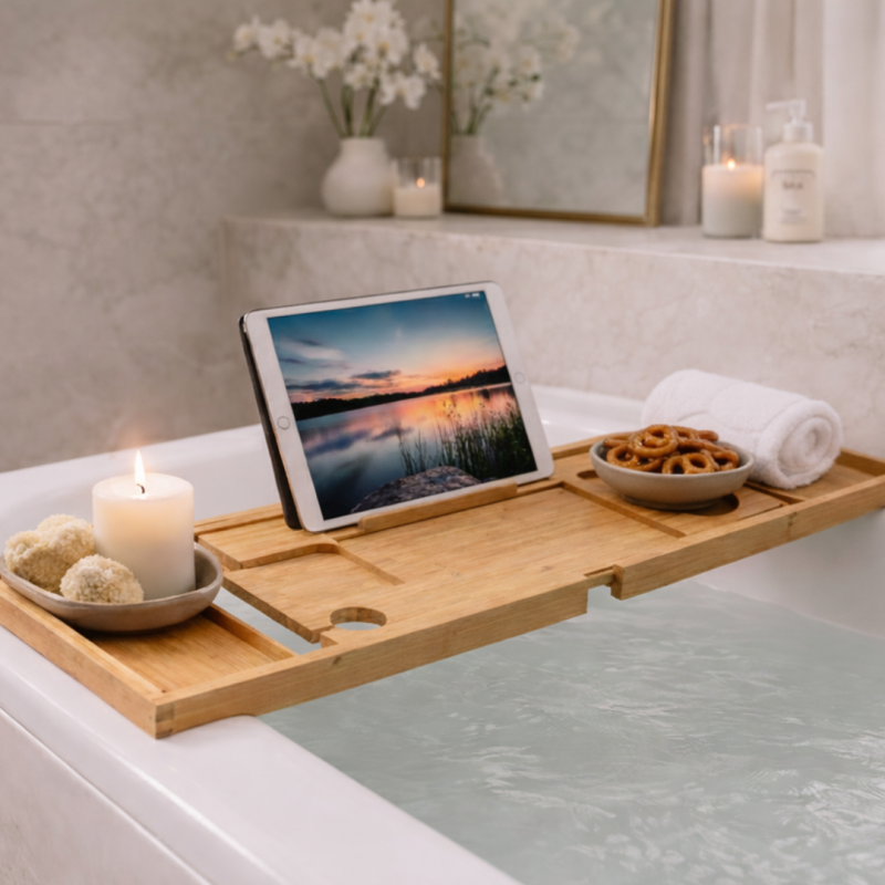 Plateau de baignoire extensible en bambou – Support bain antidérapant multifonction