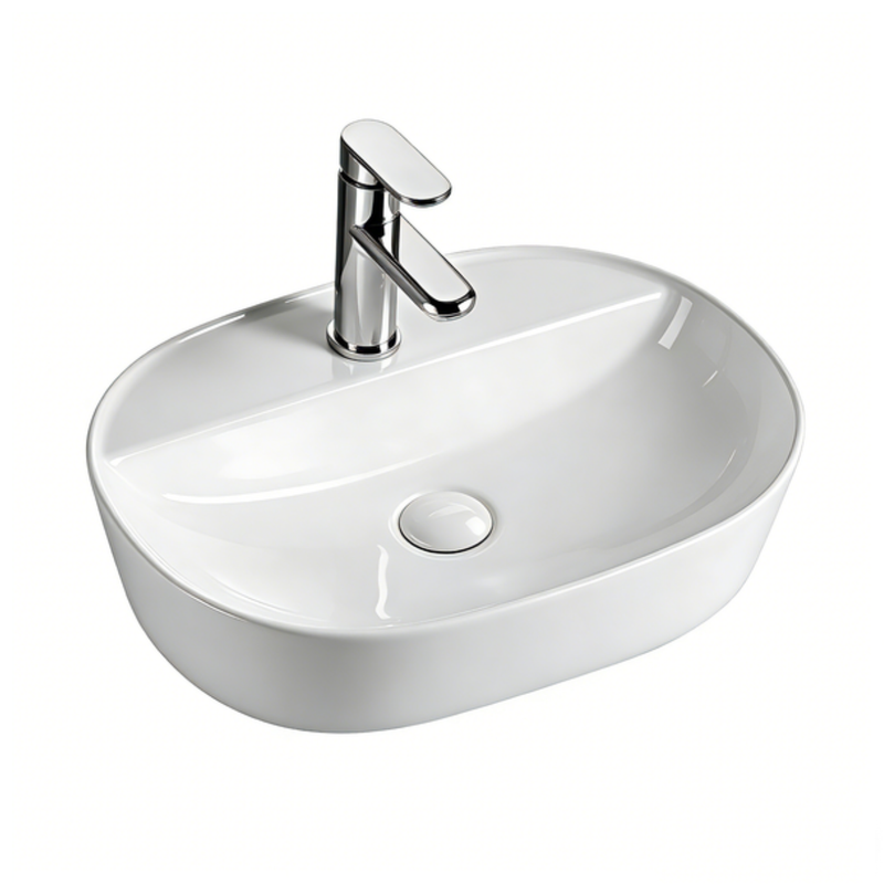 Vasque à poser ovale RIVA en céramique sanitaire, disponible en 58 x 36,5 cm ou 50 x 32 cm.