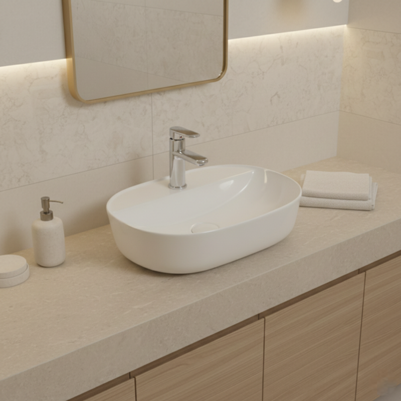 La vasque à poser NOXA se distingue par une esthétique douce et sobre, adaptée aussi bien aux salles de bain modernes qu'aux ambiances plus classiques. Sa forme ovale harmonieuse et ses lignes équilibrées privilégient la simplicité