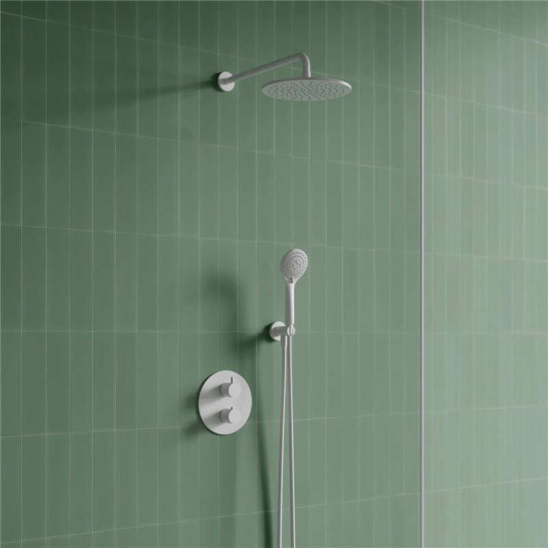 L’ensemble comprend un mitigeur thermostatique encastré à 2 sorties avec son élément encastré, une tête de douche avec bras, un pommeau de douche avec flexible ainsi qu’un raccord mural avec support, pour une installation complète.
