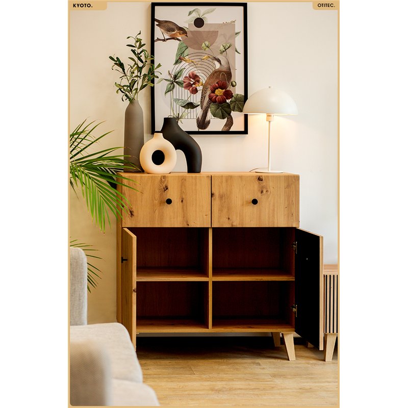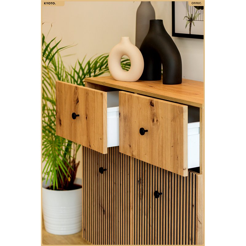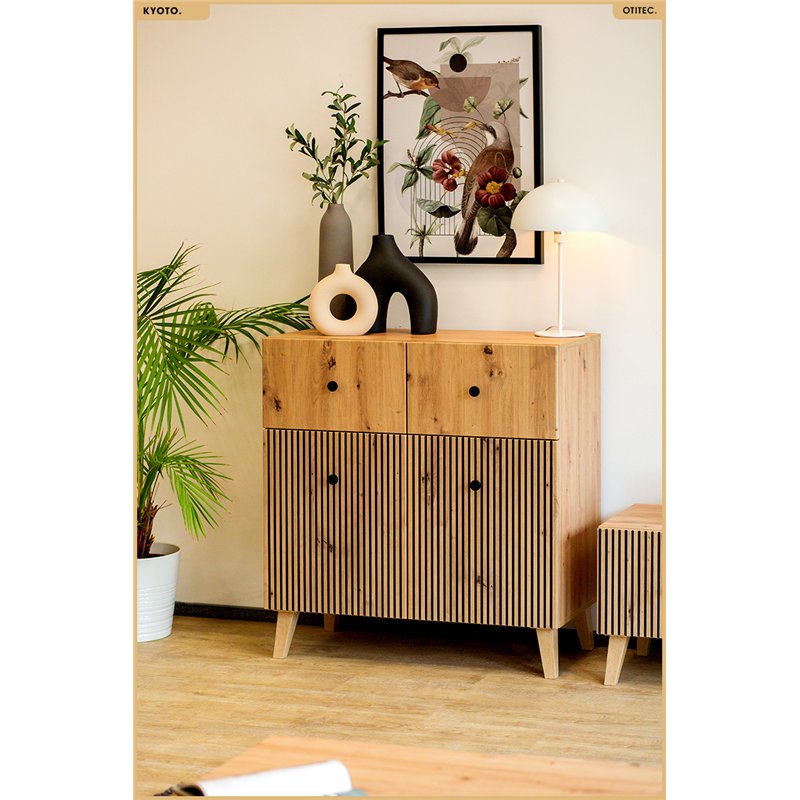 Un décor chêne naturel, des reliefs verticaux et des lignes sobres : KYOTO impose une présence chaleureuse et structurée, qui apporte du caractère sans alourdir l’espace. Conçue pour traverser les tendances, elle s’intègre aussi bien dans un intérieur contemporain que plus classique.