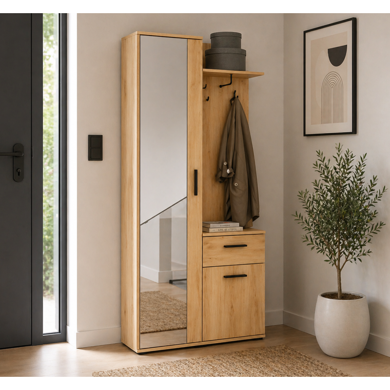 • Agencement complet : Penderie avec tringle métallique, miroir pleine hauteur, tiroir intégré, niches ouvertes et étagères fermées. Chaque élément est conçu pour un accès direct et un usage fluide.