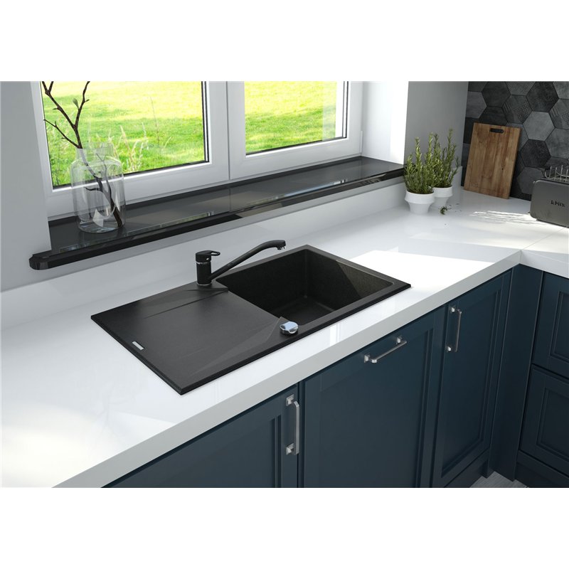 Évier en granit EVORA 1 cuve avec égouttoir, résistant à la chaleur et aux chocs, avec siphon compact inclus.